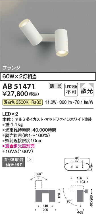 ●補足・注意事項: ◆消費電力:11.0W,◆色温度:3500K,◆演色性:Ra83,◆光源寿命:40,000時間,◆直付・壁付・傾斜天井取付可能,◆調光範囲(100~約1%),◆適合調光器別売,◆照射近接限度10cm,※色温度:3500K