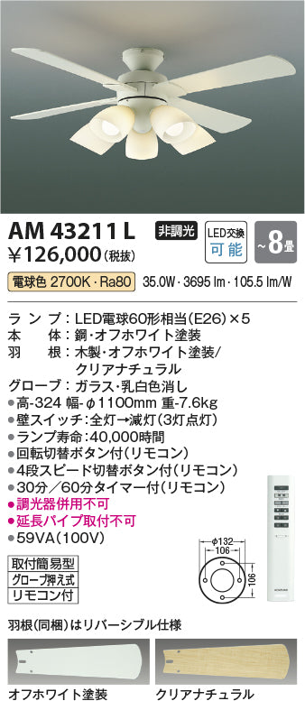 ●補足・注意事項: ◆消費電力:39.0W,◆色温度:2700K,◆演色性:Ra84,◆光源寿命:40,000時間,◆専用リモコン付,◆回転切替スイッチ付(リモコン),◆4段スピード切替スイッチ付(リモコン),◆30分/60分タイマー付(リモコン),◆調光器併用不可,◆延長パイプ取付不可,※色温度:2700K