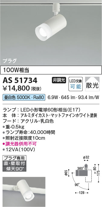 ●補足・注意事項: ◆消費電力:6.9W,◆色温度:5000K,◆演色性:Ra80,◆光源寿命:40,000時間,◆直付・壁付・傾斜天井取付可能,◆調光器併用不可,◆照射近接限度10cm,※色温度:5000K