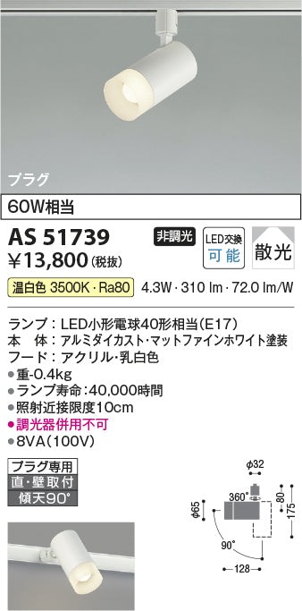 ●補足・注意事項: ◆消費電力:4.3W,◆色温度:3500K,◆演色性:Ra80,◆光源寿命:40,000時間,◆直付・壁付・傾斜天井取付可能,◆調光器併用不可,◆照射近接限度10cm,※色温度:3500K