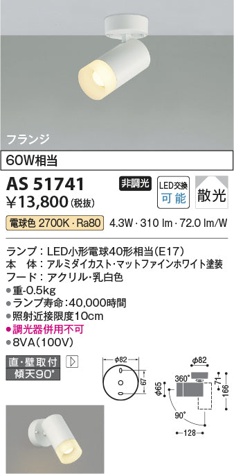 ●補足・注意事項: ◆消費電力:4.3W,◆色温度:2700K,◆演色性:Ra80,◆光源寿命:40,000時間,◆直付・壁付・傾斜天井取付可能,◆調光器併用不可,◆照射近接限度10cm,※色温度:2700K